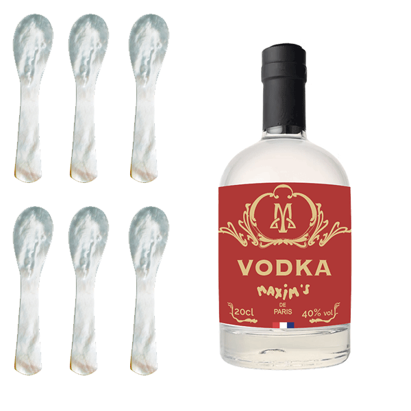 6 cuillères en nacre 9 cm et vodka Maxim’s 20 cl